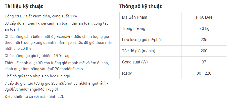 Thông số kỹ thuật quạt trần 5 cánh Panasonic F-60TAN có điều khiển từ xa